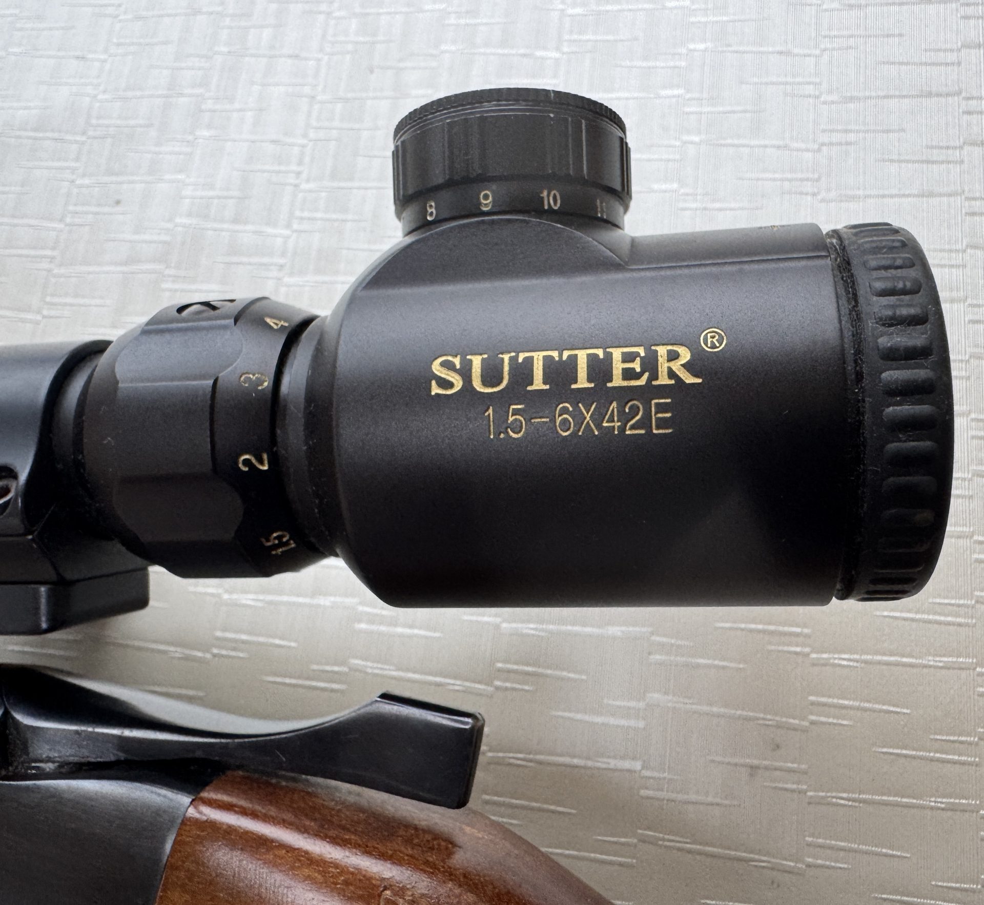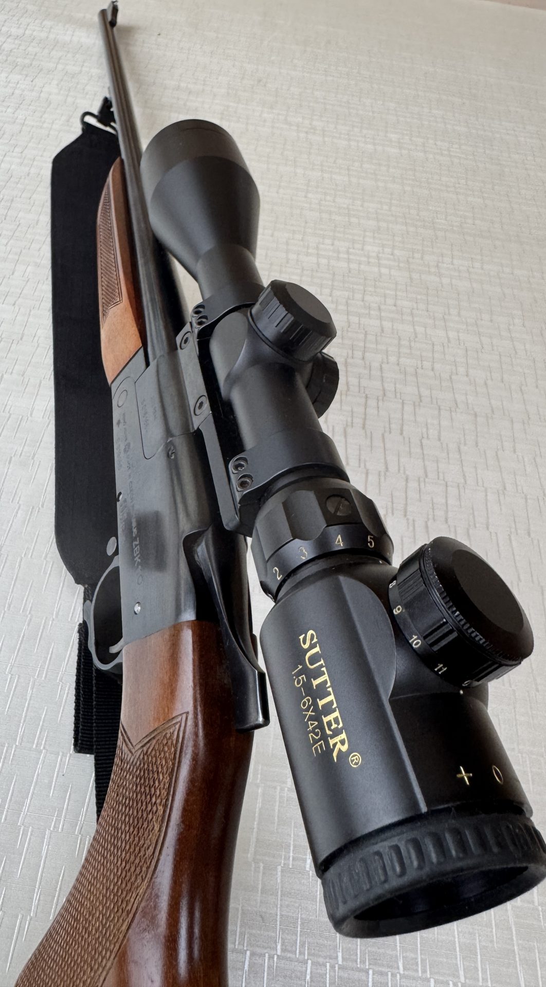 Montiert ist ein Sutter 1,5-6X42R mit Leuchtabsehen.