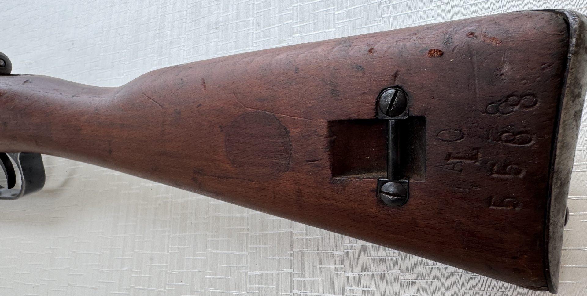 Der Schaft befindet sich ebenfalls in sehr gutem Zustand mit ehrlicher Patina. Keine Überarbeitung, keine Schleifspuren oder Nachbehandlungen. Altersbedingte, leichte Gebrauchsspuren sind vorhanden, jedoch keine strukturellen Beschädigungen.