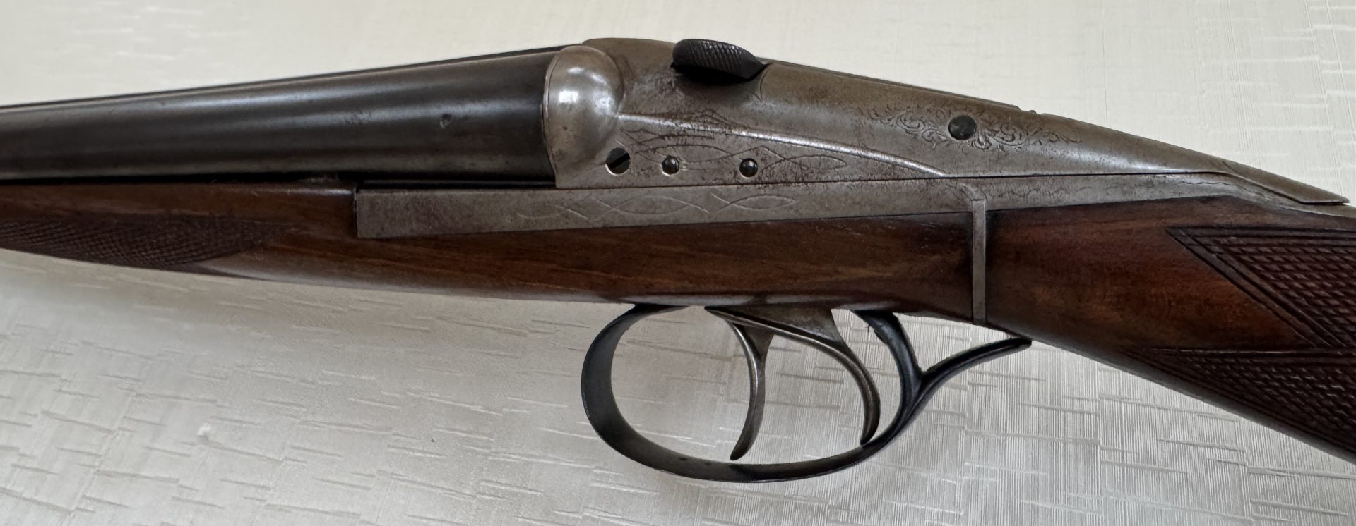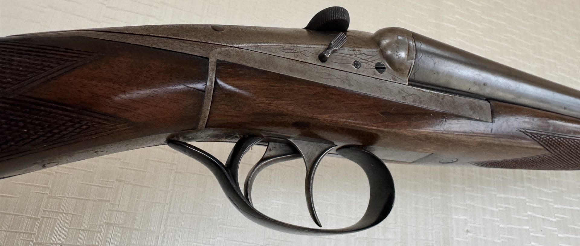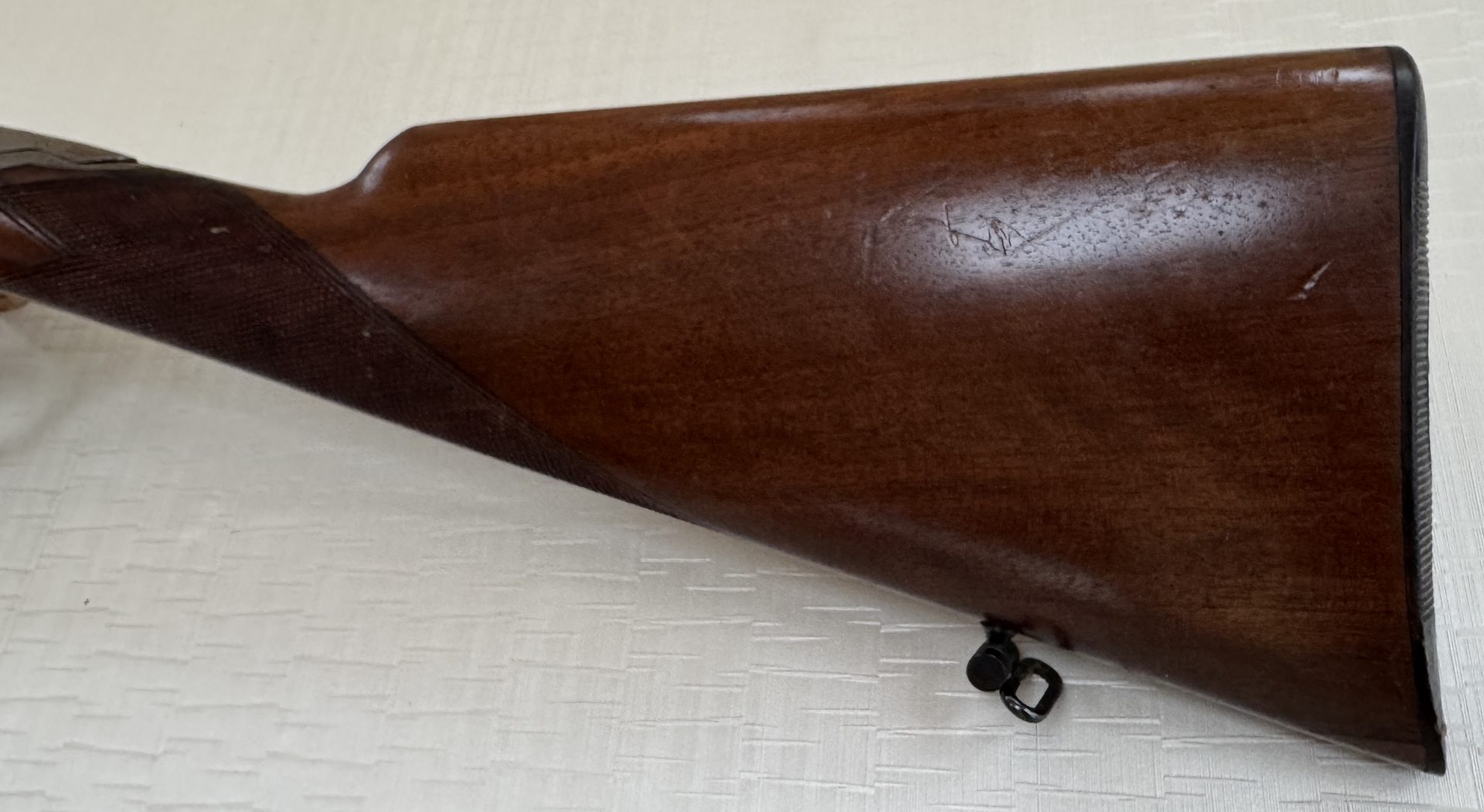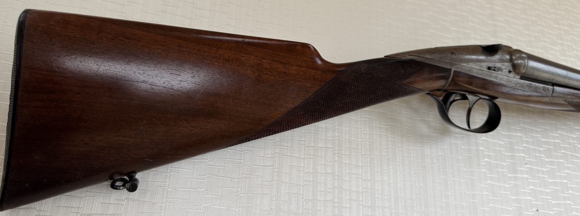 Schaft: Englischer Nussbaumschaft mit fein geschnittener Fischhaut, angenehme Handlage