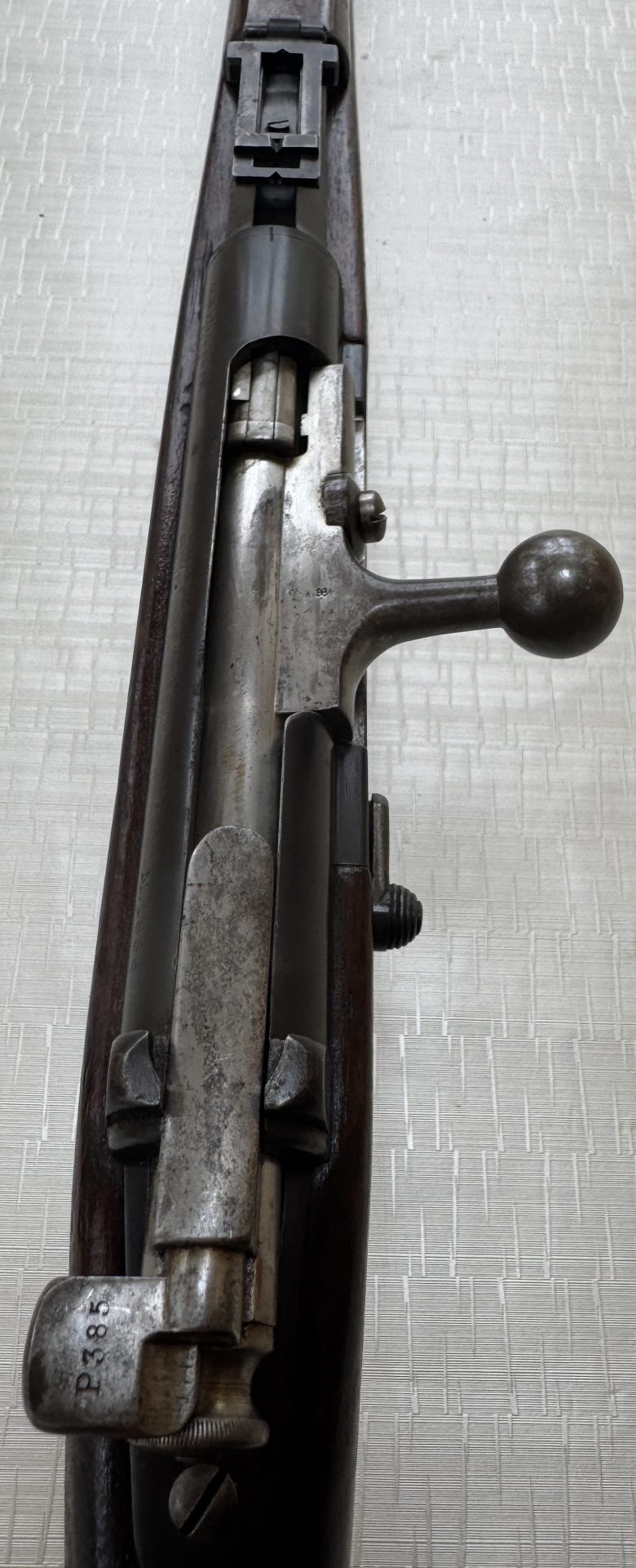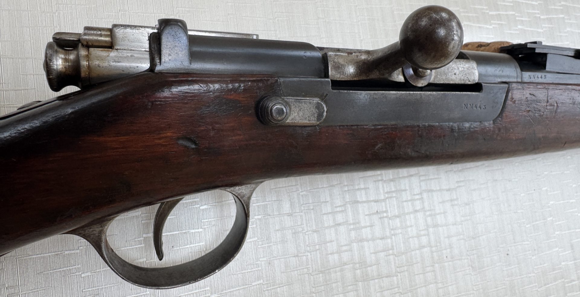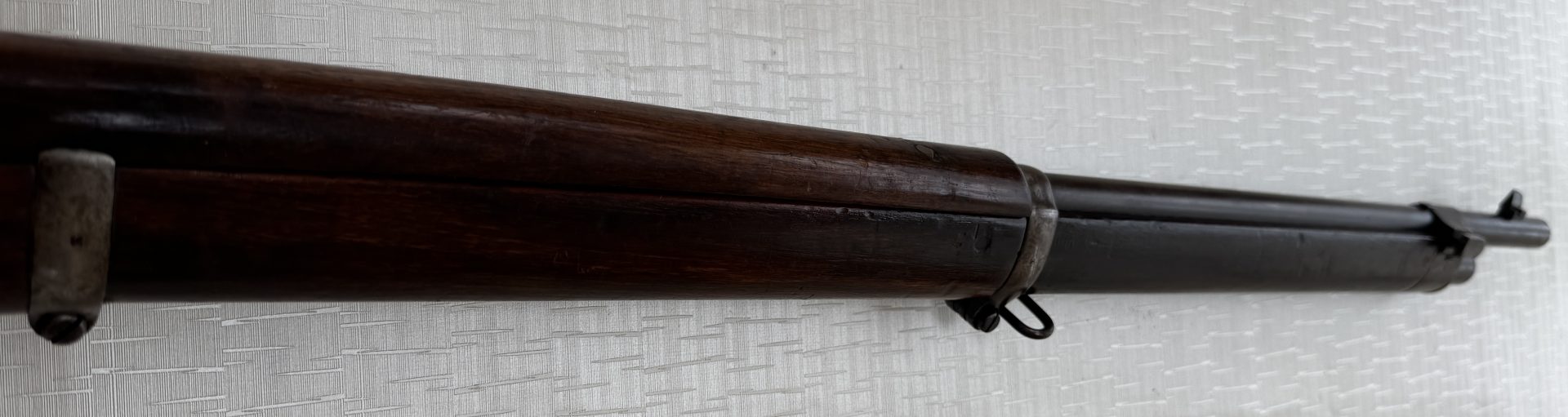 Das Gewehr befindet sich in einem ehrlichen, sammelwürdigen Erhaltungszustand, ohne Bastelarbeiten oder moderne Eingriffe. Besonders hervorzuheben sind der sehr gute Lauf, die unveränderte Schäftung sowie die weitgehend erhaltene Originalbrünierung, was bei Waffen dieses Alters keine Selbstverständlichkeit ist.