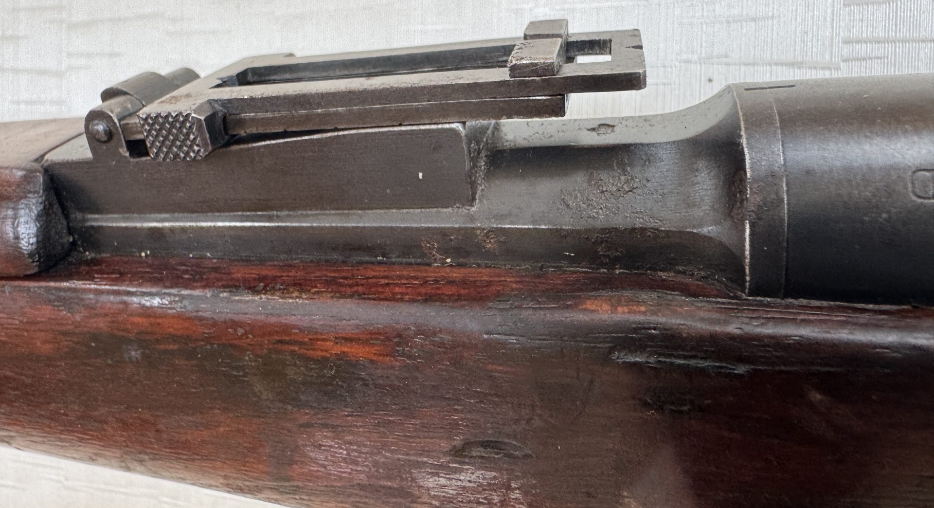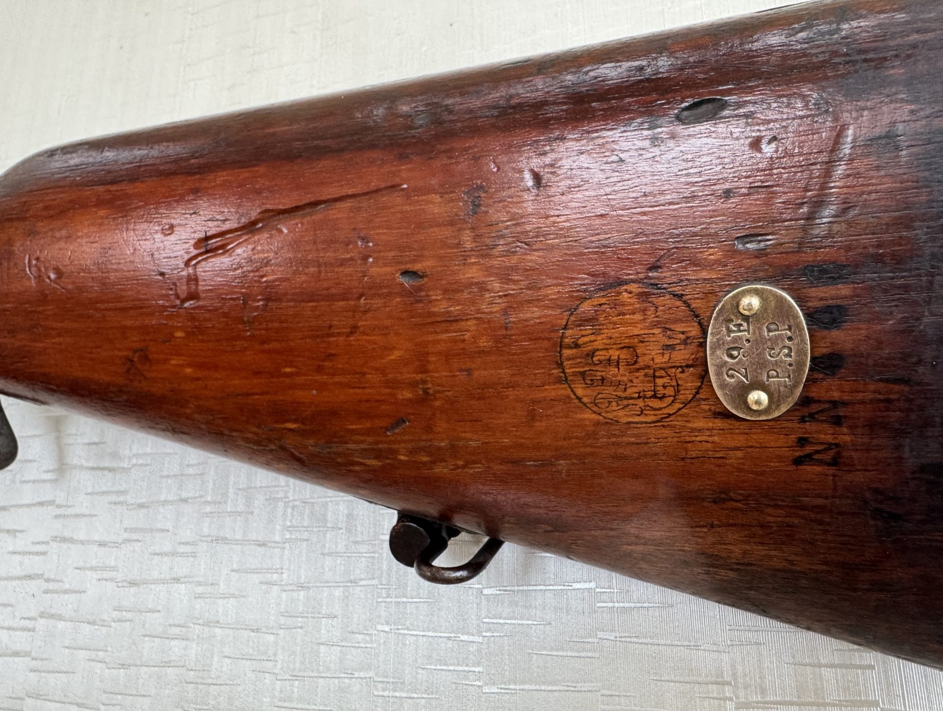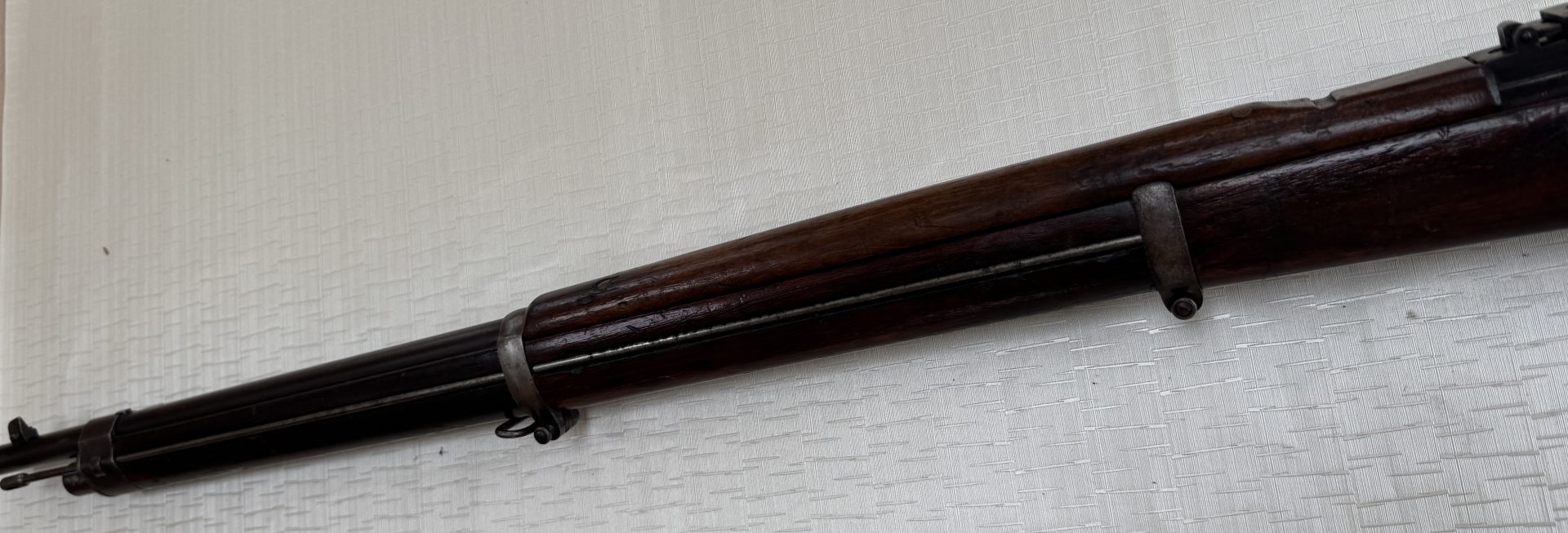 Das Gewehr befindet sich in einem ehrlichen, sammelwürdigen Erhaltungszustand, ohne Bastelarbeiten oder moderne Eingriffe. Besonders hervorzuheben sind der sehr gute Lauf, die unveränderte Schäftung sowie die weitgehend erhaltene Originalbrünierung, was bei Waffen dieses Alters keine Selbstverständlichkeit ist.