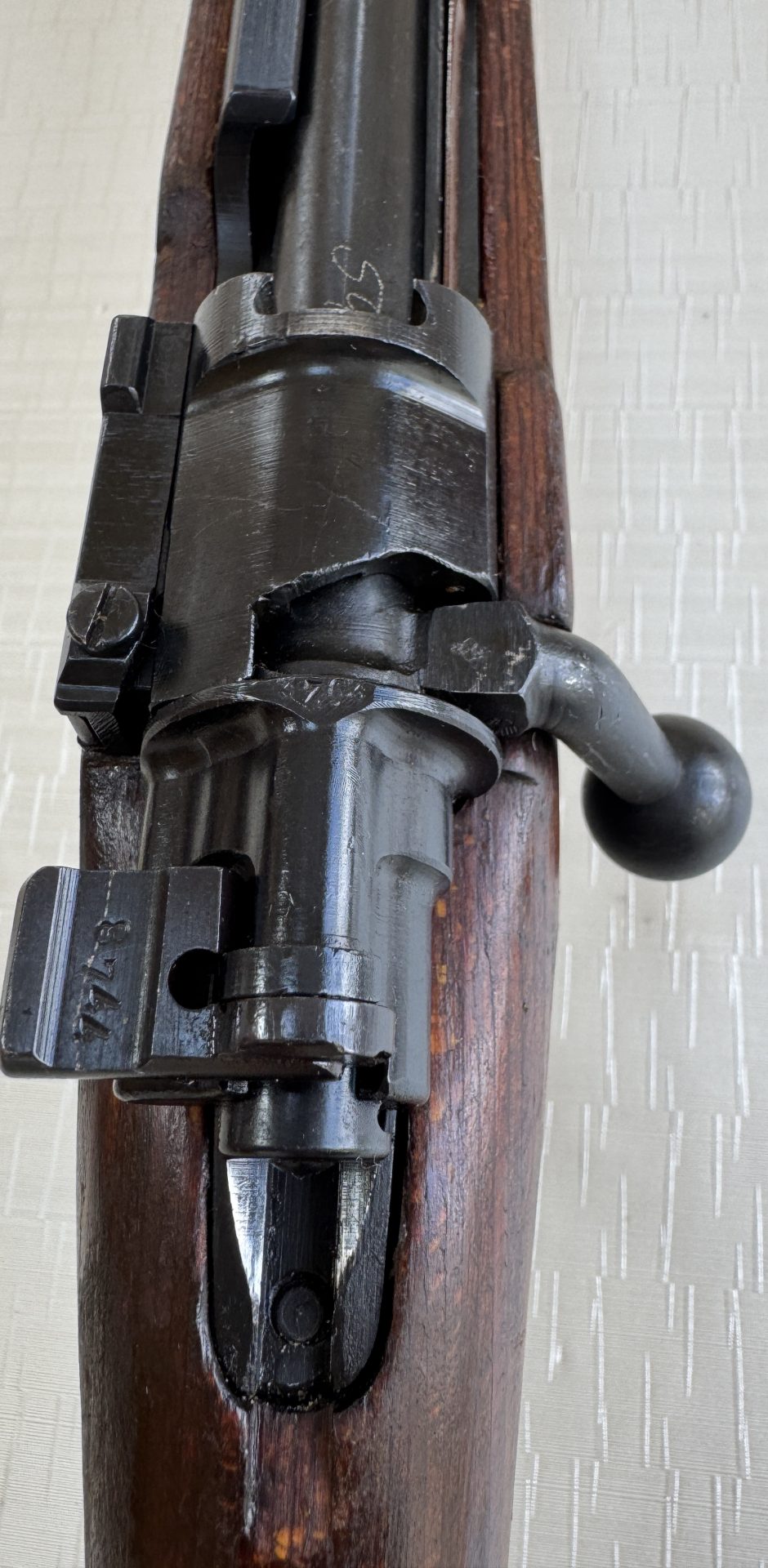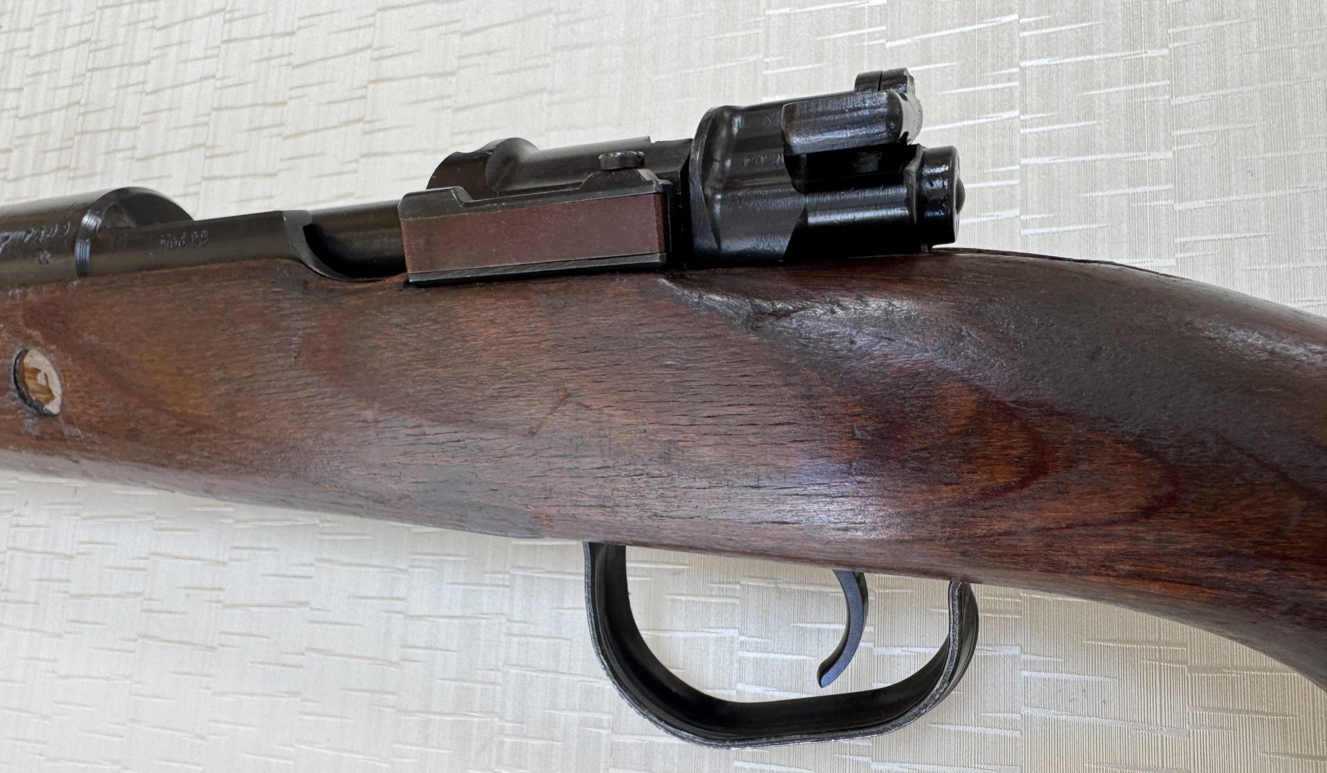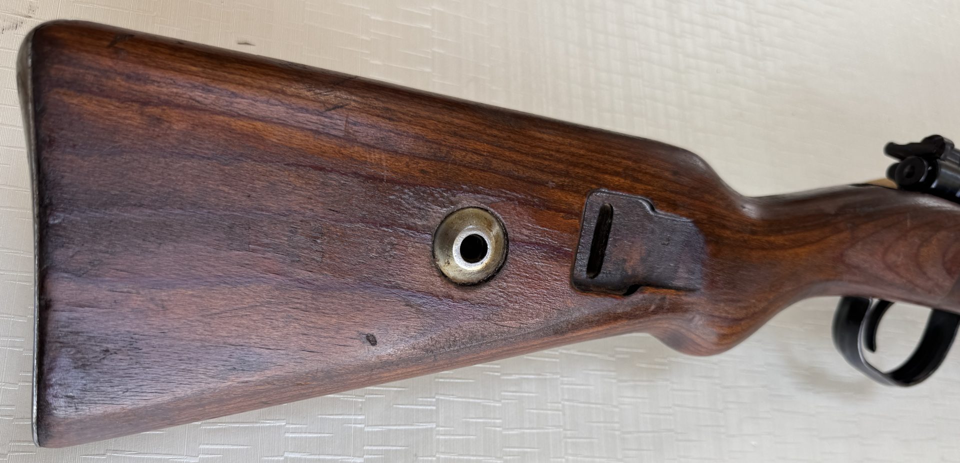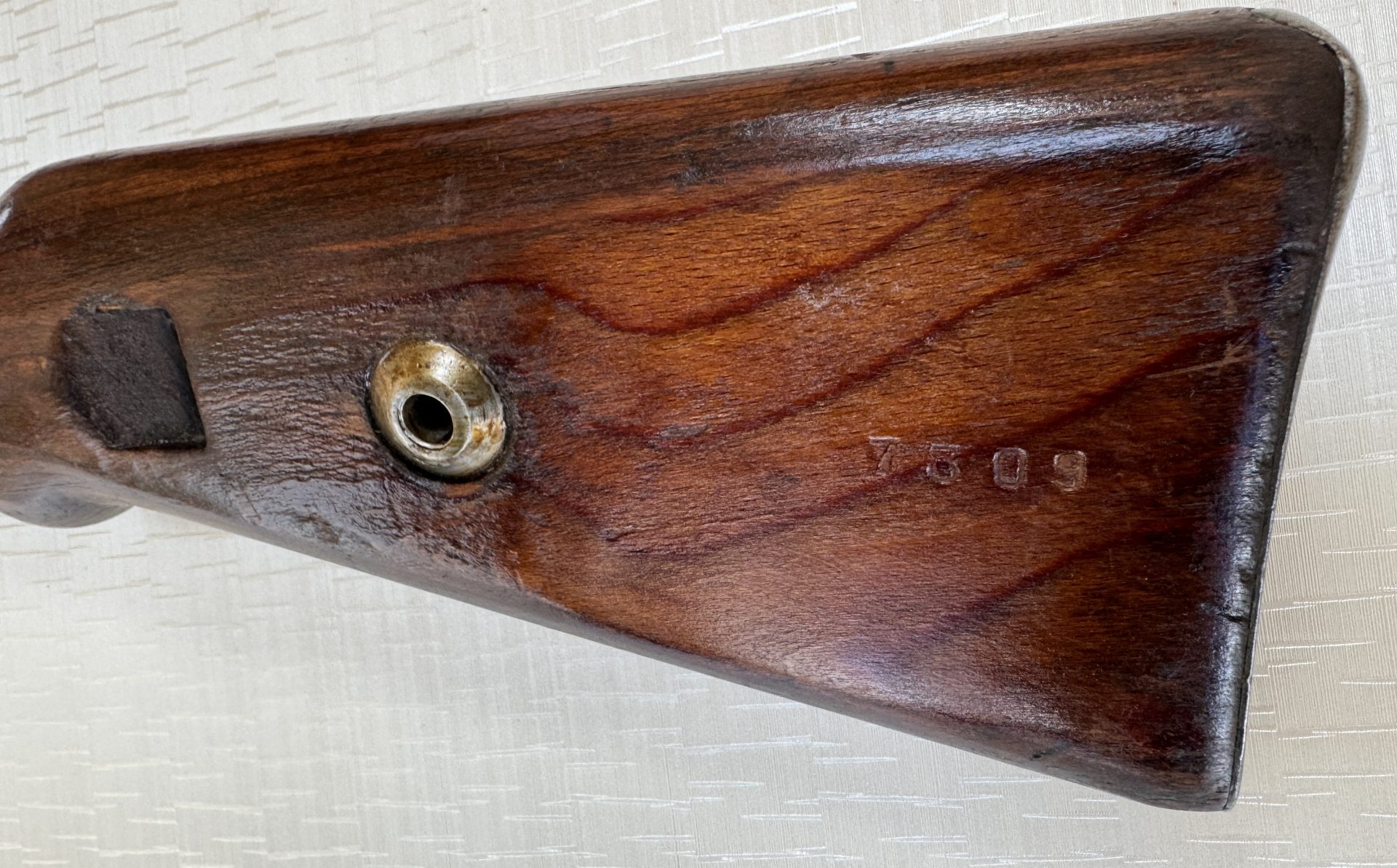 Originaler Nussbaumschaft ohne Risse oder strukturelle Beschädigungen. Der Schaft befindet sich in gutem Zustand mit lediglich leichten, altersbedingten Gebrauchsspuren.