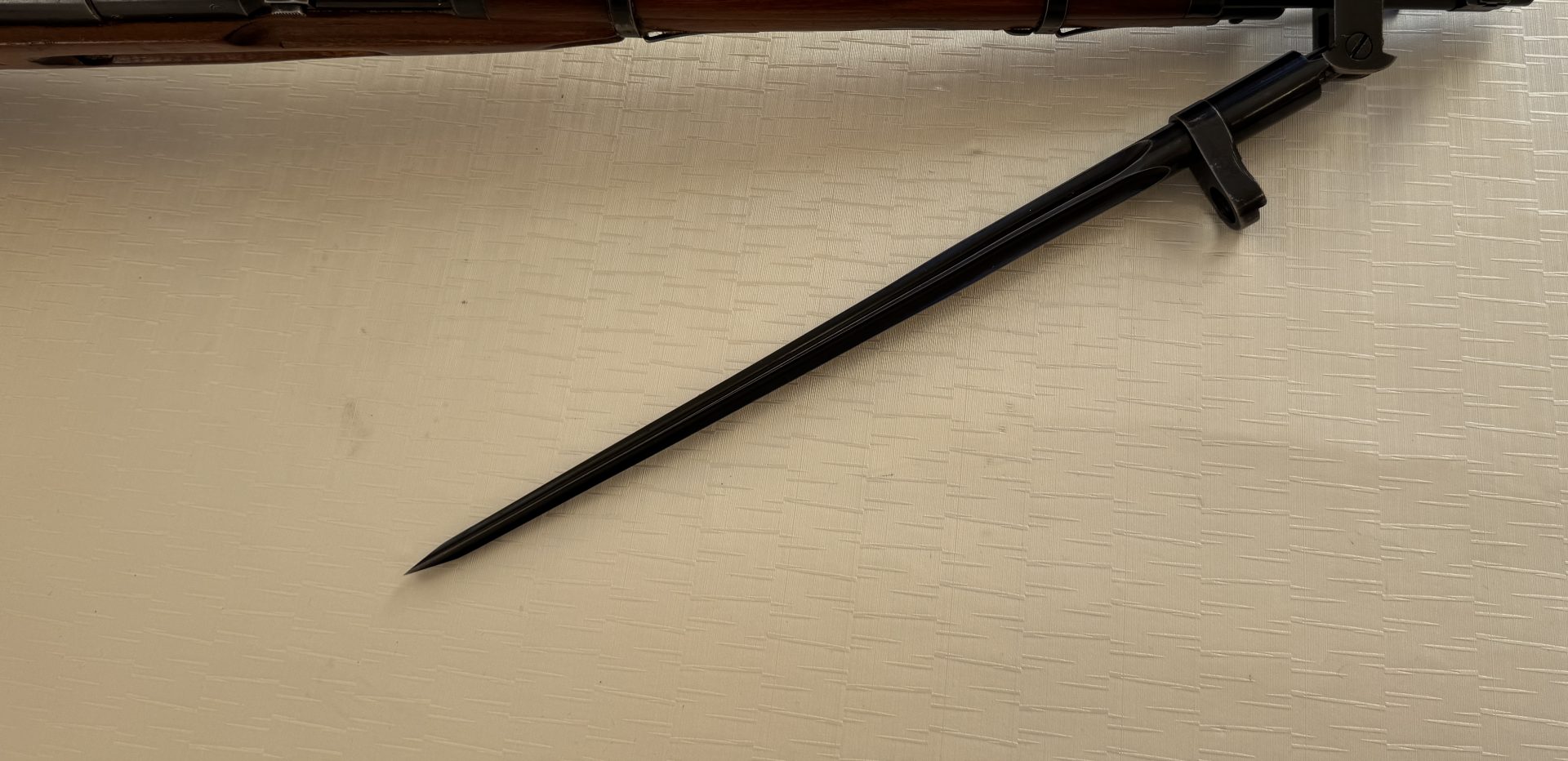 Bajonett: Original fest angebrachtes, seitlich klappbares Spike-Bajonett, nummerngleich, rastet sauber ein
