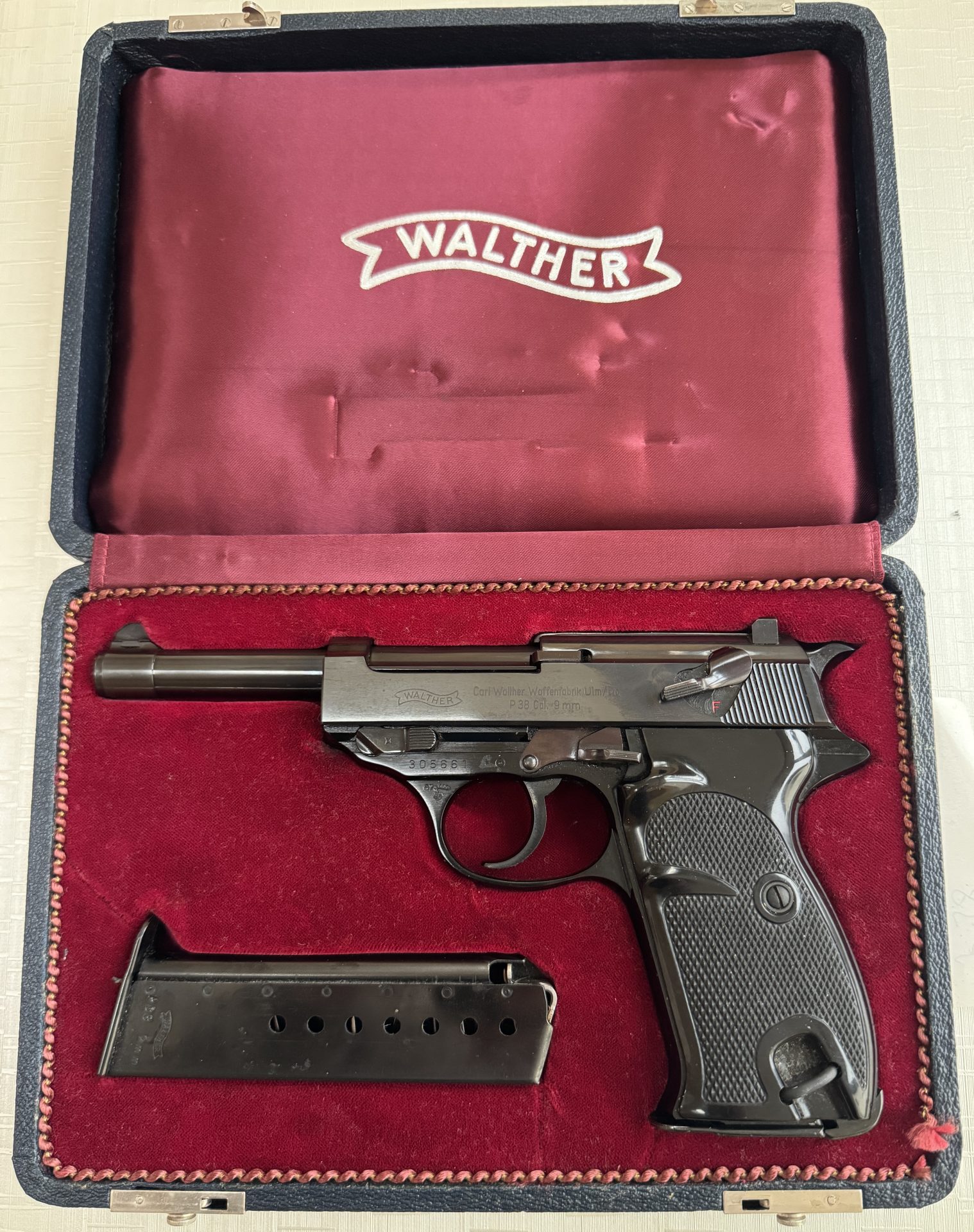 Zum Verkauf steht eine außergewöhnlich hochwertige Walther P38 (Export) aus privater Sammlung. Diese Pistole besticht durch ihre seltene und äußerst elegante Hochglanz- bzw. Politausführung, die deutlich über die übliche Serienfertigung hinausgeht. Das Stück befindet sich in einem absolut neuwertigen Zustand und wurde über Jahre hinweg ausschließlich sammlerisch aufbewahrt.