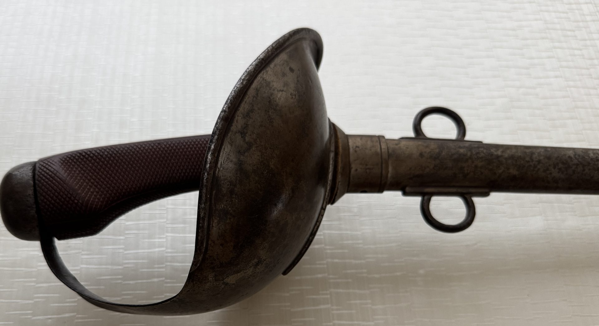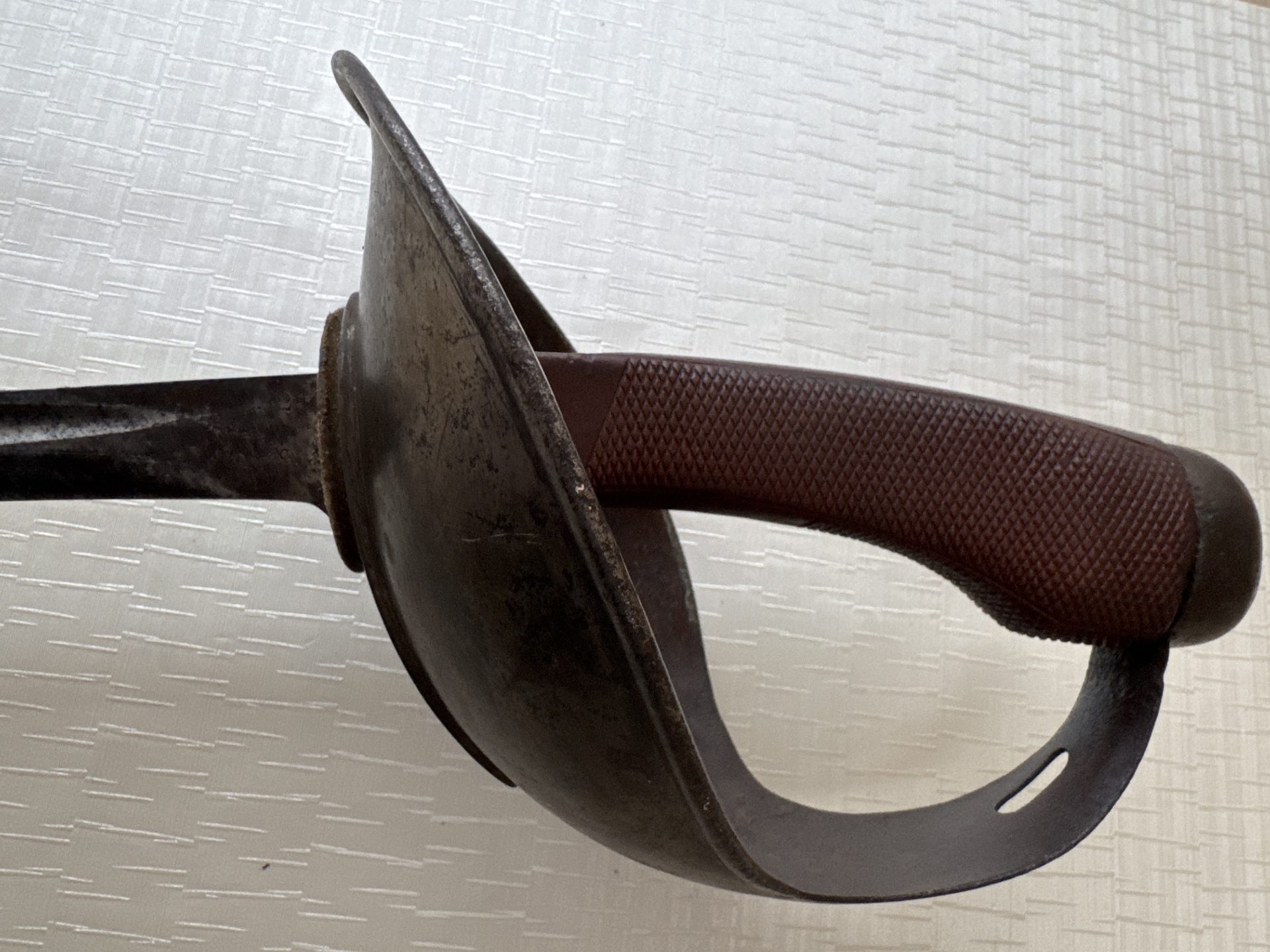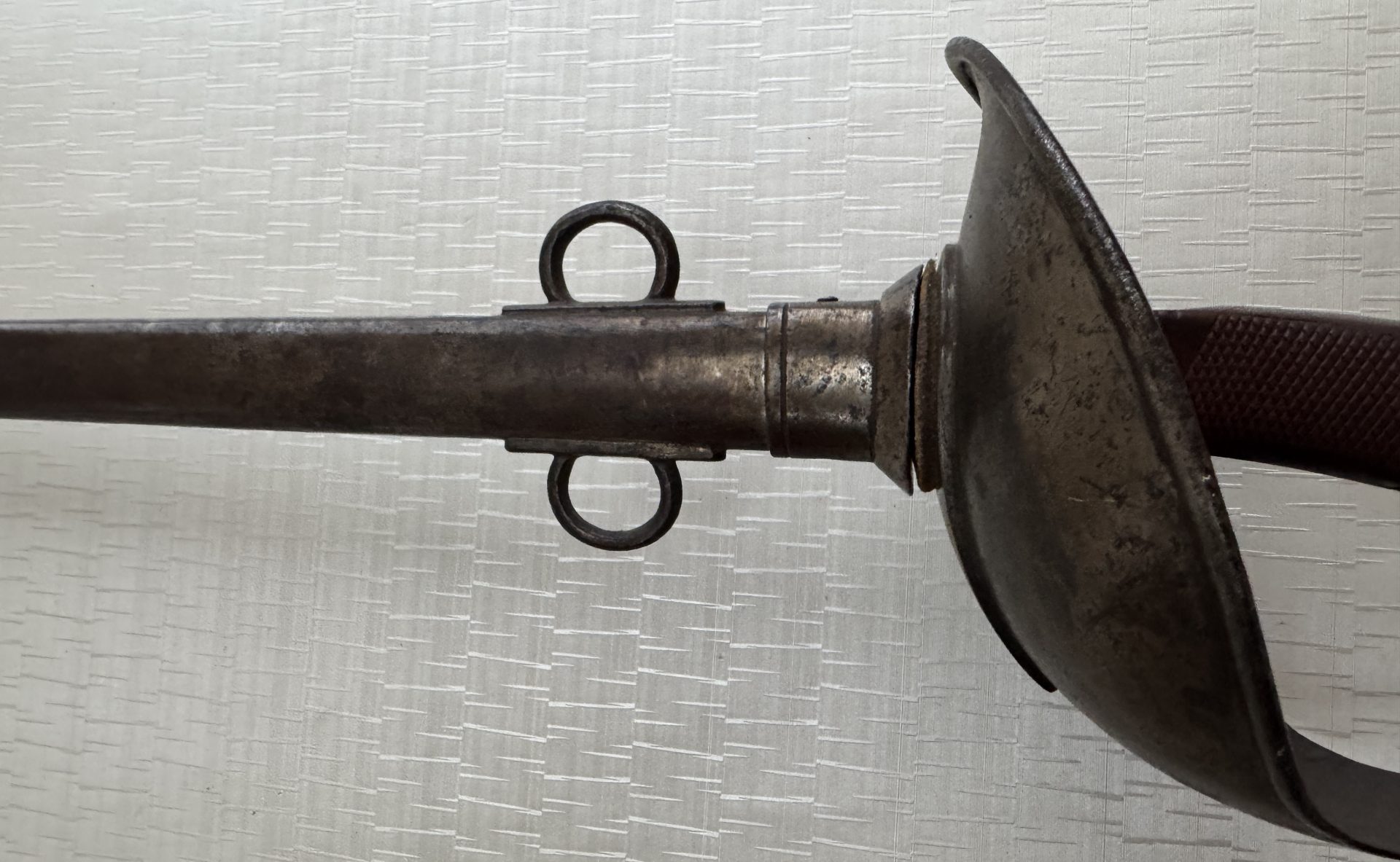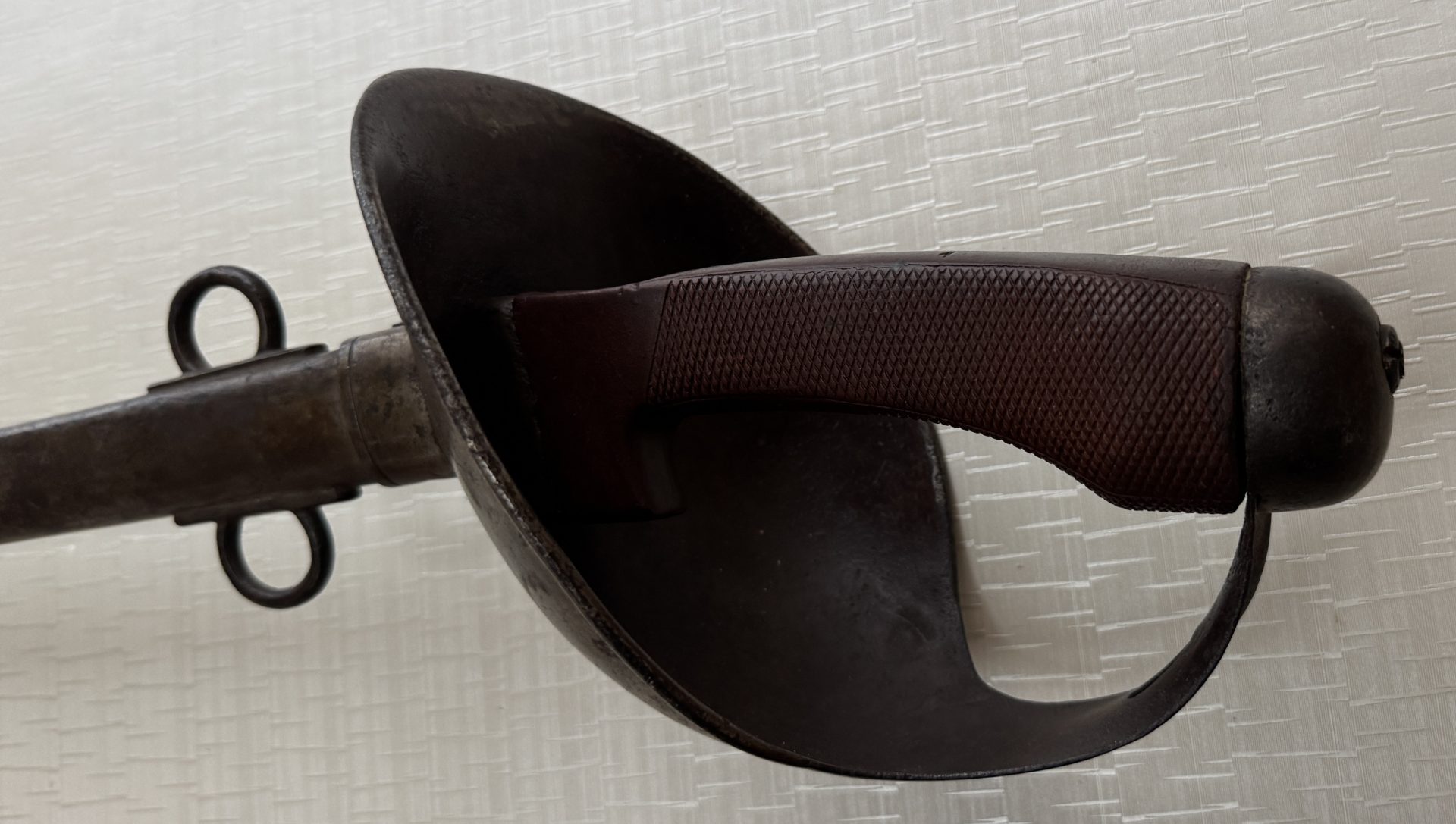 Besonders bemerkenswert ist die original erhaltene Metallscheide mit zwei Trageringen, die es ermöglicht, den Säbel sowohl am Gürtel als auch an der Ausrüstung zu tragen. Die Scheide ist in sehr gutem Zustand und zeigt nur minimale Gebrauchsspuren, passend zum Alter des Stückes.