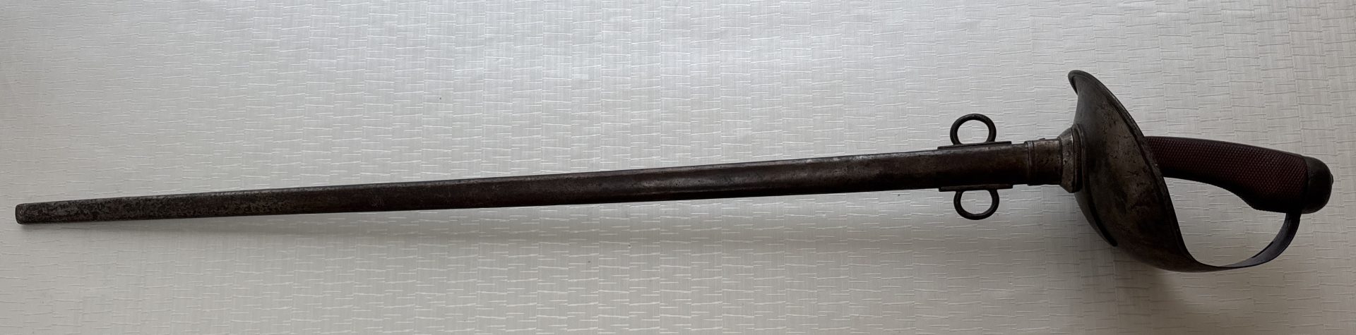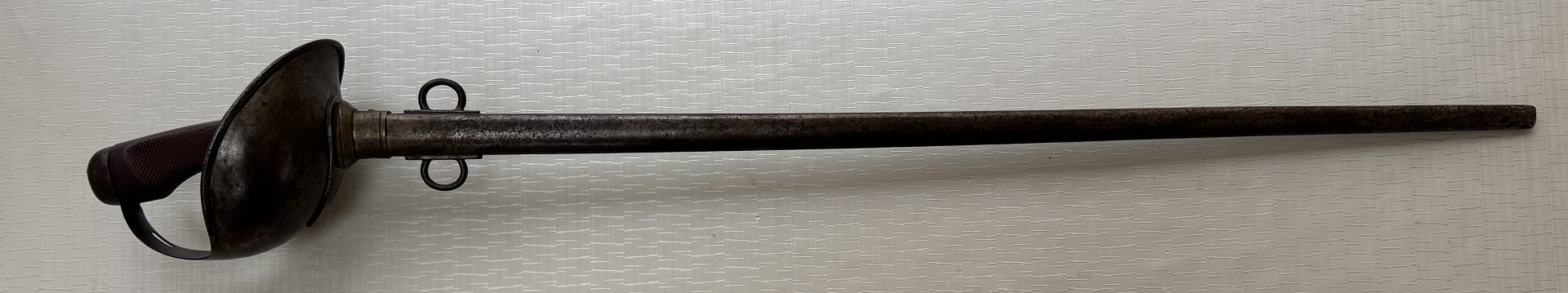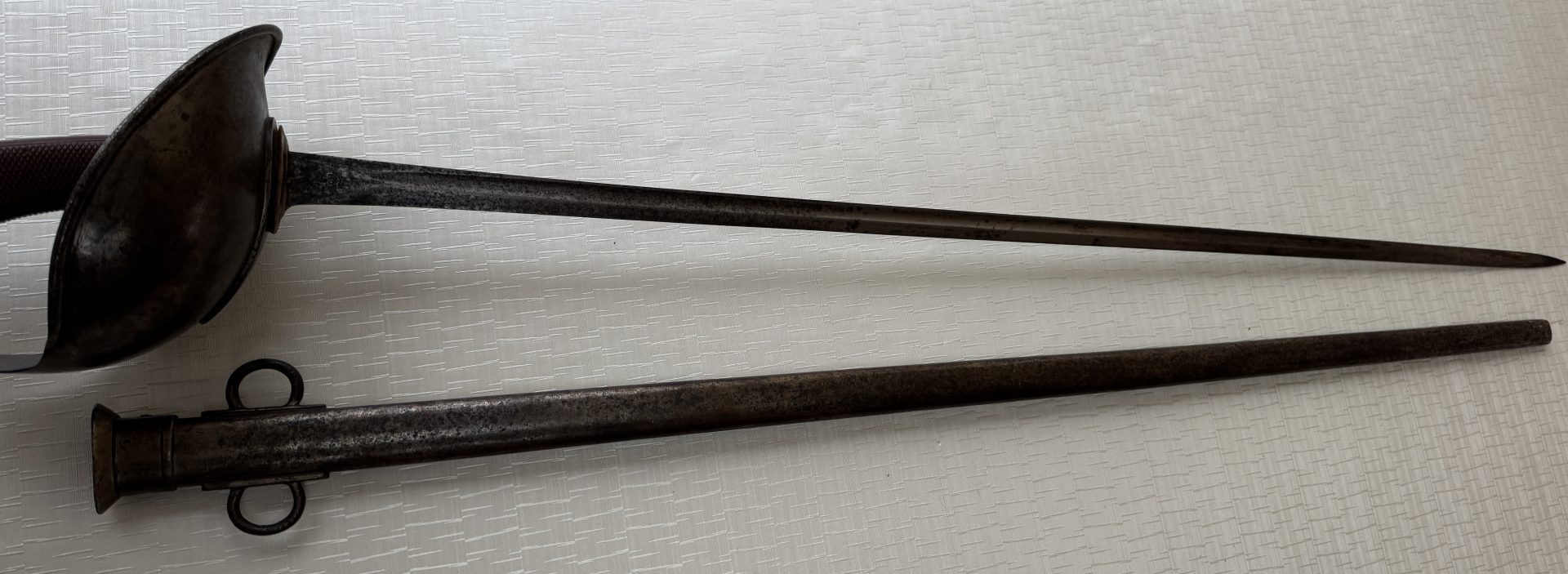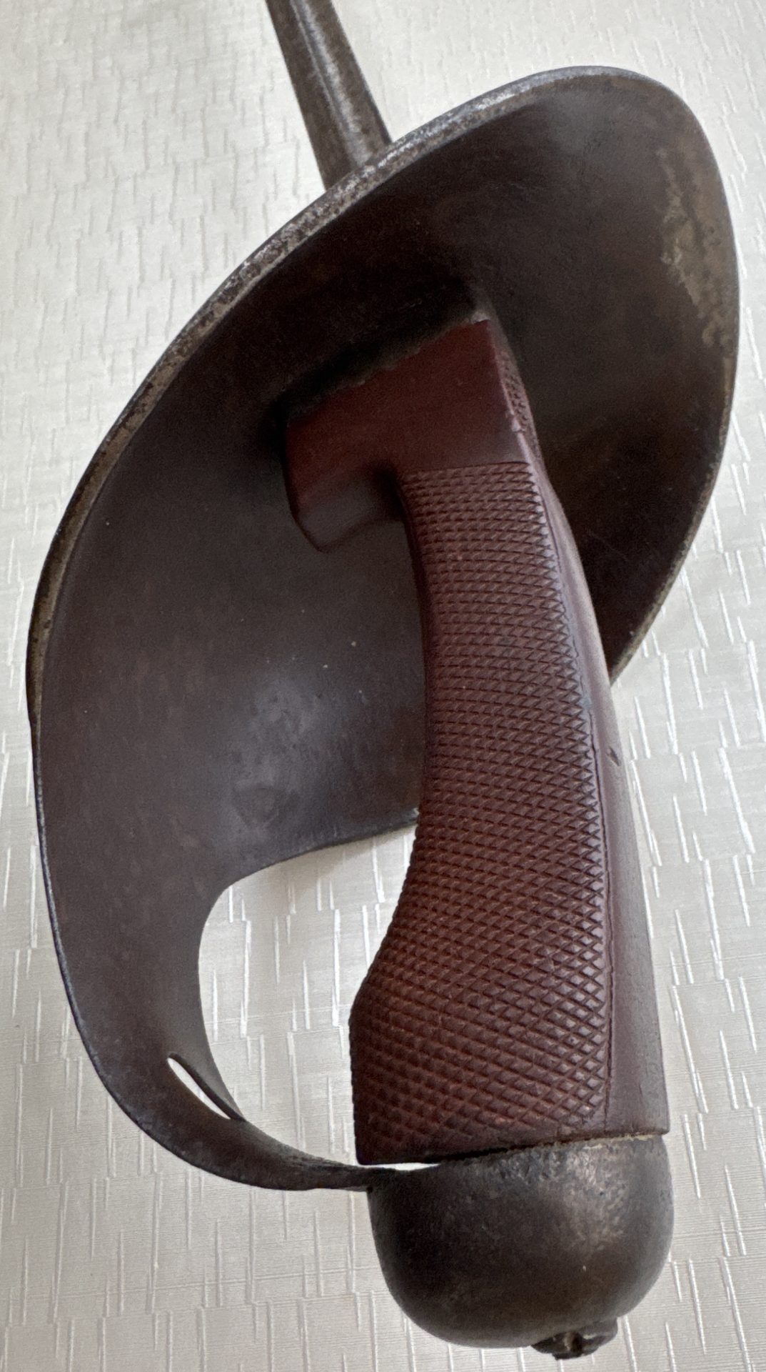 Besonders bemerkenswert ist die original erhaltene Metallscheide mit zwei Trageringen, die es ermöglicht, den Säbel sowohl am Gürtel als auch an der Ausrüstung zu tragen. Die Scheide ist in sehr gutem Zustand und zeigt nur minimale Gebrauchsspuren, passend zum Alter des Stückes.