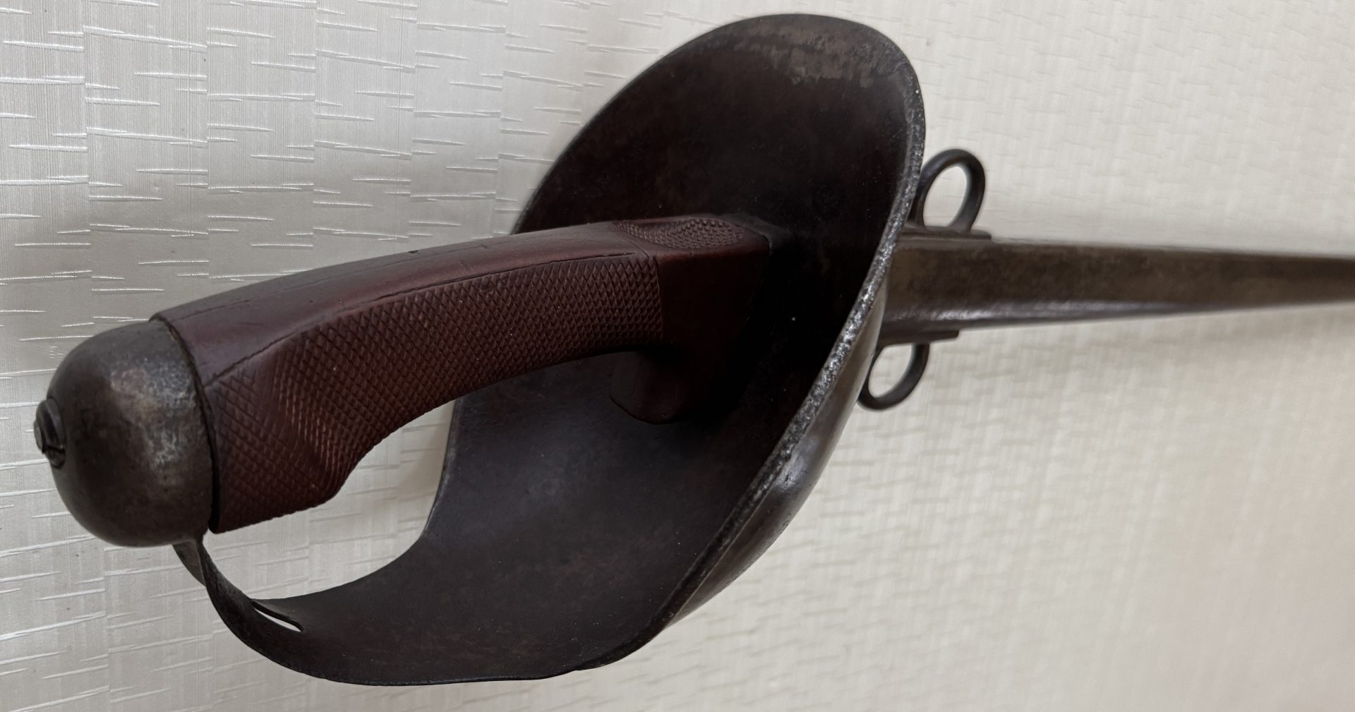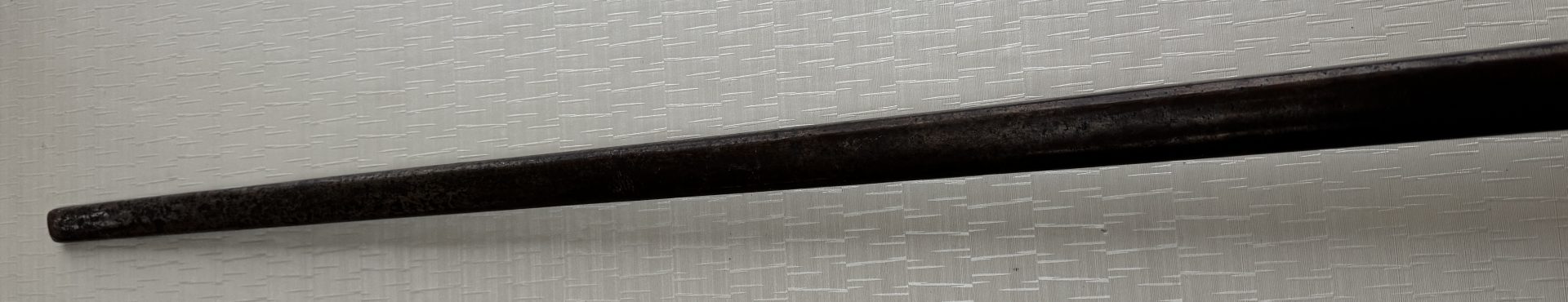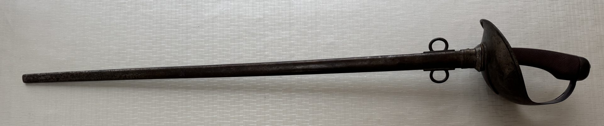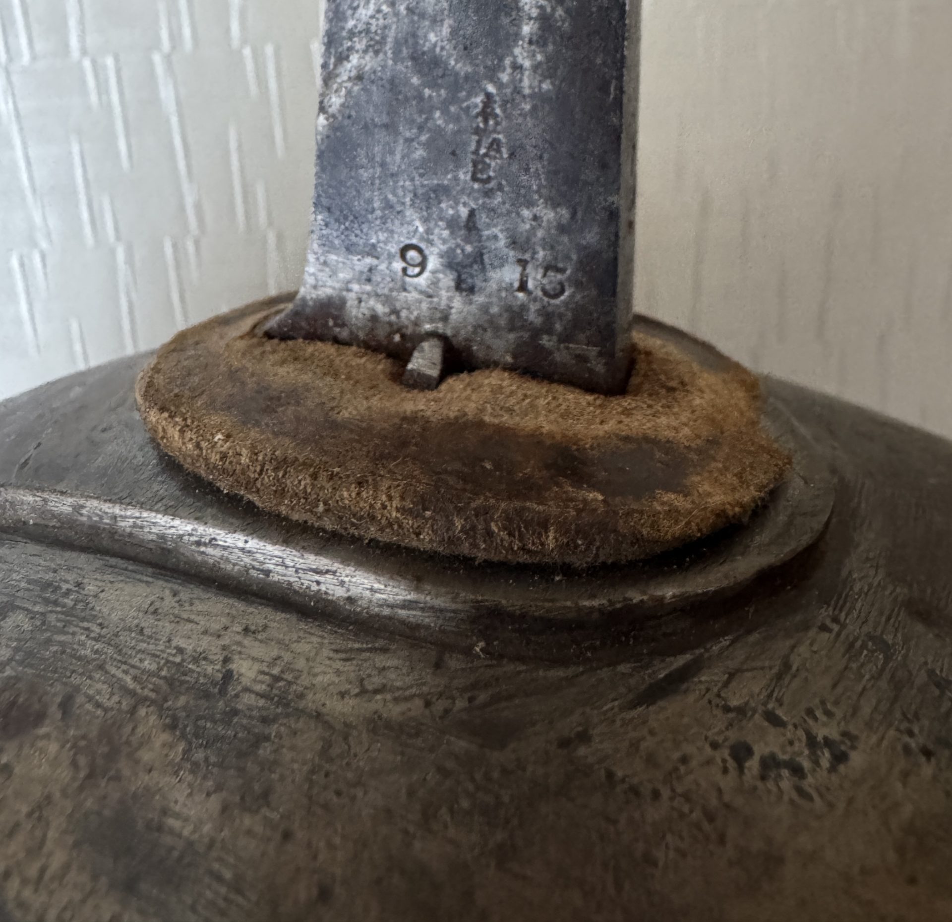 Besonders bemerkenswert ist die original erhaltene Metallscheide mit zwei Trageringen, die es ermöglicht, den Säbel sowohl am Gürtel als auch an der Ausrüstung zu tragen. Die Scheide ist in sehr gutem Zustand und zeigt nur minimale Gebrauchsspuren, passend zum Alter des Stückes.